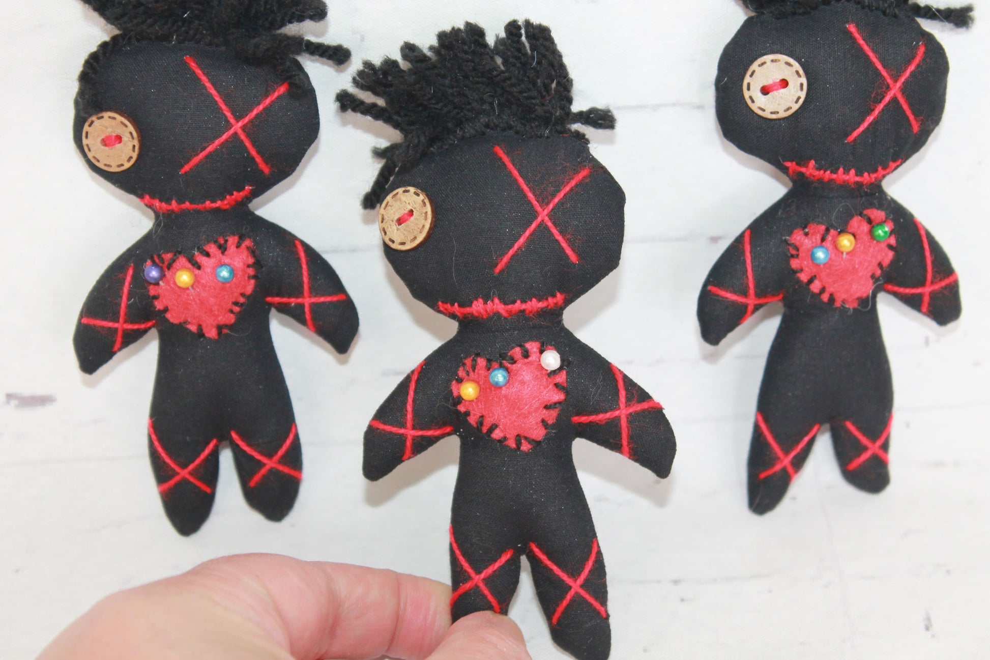 Set of 3 Black Voodoo Dolls with Red Hearts and Pins – Handmade 4 Inch Creepy Cute Gothic Decor